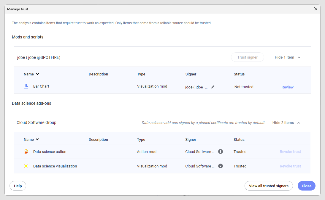 Wenn eine MOD oder externe Aktion signiert ist, ist es einfacher zu entscheiden, ob Sie ihr vertrauen können. Das heißt, Sie stufen das Unternehmen oder die Person als vertrauenswürdig ein, das bzw. die die MOD signiert hat. Es ist möglich, entweder alle von einer bestimmten Person hinzugefügten MODs oder externe Aktionen als vertrauenswürdig einzustufen (also den Signaturgeber als vertrauenswürdig einzustufen) oder nur bestimmte Elemente als vertrauenswürdig einzustufen. Data Science-Add-ons, die von der Cloud Software Group signiert wurden, werden automatisch als vertrauenswürdig eingestuft. Bei Data Science-Add-ons kann die Vertrauenswürdigkeit nur von der Cloud Software Group oder einem Administrator widerrufen werden.