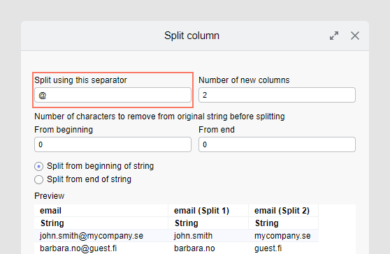 Si desea dividir una lista de direcciones de correo electrónico con el formato "nombre.apellido@empresa.país", puede que Spotfire tenga problemas para determinar lo que usted desea hacer durante su operación de división, por lo es posible que deba realizar algunos ajustes manuales.
