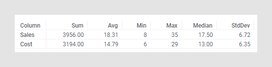 요약 테이블은 데이터에 대한 통계 정보를 테이블 형식으로 요약한 시각화입니다. 정보는 분석에 있는 데이터 테이블 하나를 기반으로 합니다. 요약 테이블을 구성할 때 표시할 측정(예: 평균, 중앙값 등)과 이러한 측정의 기반이 되는 컬럼을 선택할 수 있습니다.