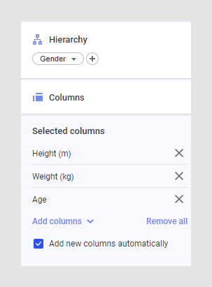 다른 데이터 하위 집합에 대한 별도의 통계를 원한다면 플라이아웃에서 범주형 컬럼을 선택한 후 범주화 제거 대상 중 하나에 드롭할 수 있습니다. 선택한 컬럼으로만 분류하려면 컬럼을