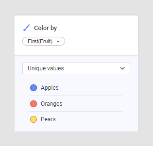 Um eine bestimmte Obstsorte zu finden, wird jeder Sorte eine bestimmte Farbe zugewiesen. Apfel-Kacheln kann beispielsweise Rot zugewiesen werden, Birnen-Kacheln Grün und Orangen-Kacheln Orange. Nehmen Sie dazu die folgenden Einstellungen im Abschnitt „Farben“ der KPI-Einstellungen vor:
