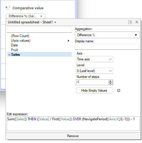 Um die relativen Umsatzzahlen im Vergleich zu denjenigen des vorherigen Tages anzuzeigen, ist die Eingabe eines Ausdrucks auf der Achse „Bezugswert“ erforderlich. Im Spaltenselektor sind Verknüpfungen zu anderen Ausdrücken verfügbar. Bei Auswahl von Unterschied % als Aggregationsmethode wird der erforderliche Ausdruck direkt zur Verfügung gestellt. Der Ausdruck kann unten im erweiterten Selektor angezeigt werden.