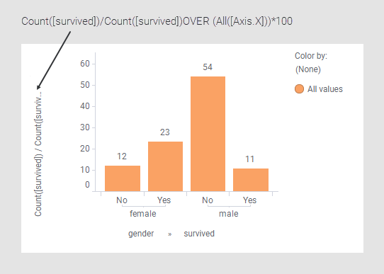 Die Teile All([Axis.X]) und All([Axis.Color]) des Ausdrucks bedeuten, dass die Unterteilung auf jeder dieser Achsen ignoriert werden soll. Die Methode Intersect() kombiniert dann diese beiden Teile. Folglich wird der Wert jedes Balkens durch die Summe aller Balken geteilt.
