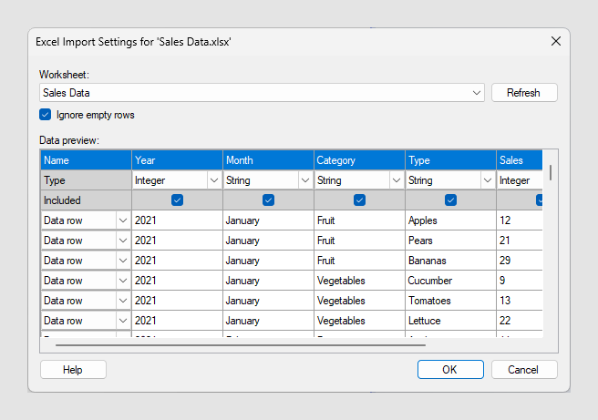 The Excel Import dialog is shown when you open Microsoft Excel files using the installed Spotfire client. You can open Excel files using the web client too, but you will not have access to as many options to tweak the import.