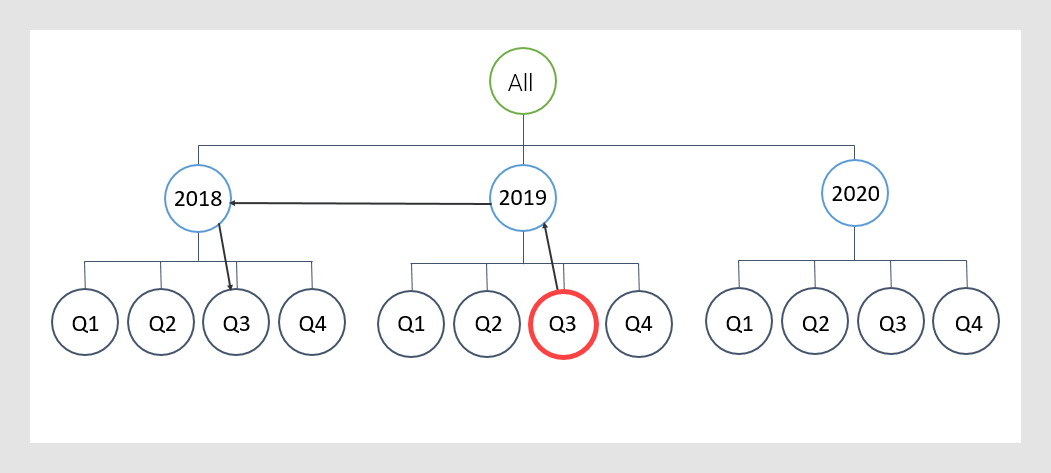 Algunos métodos de navegación de nodos resultan especialmente apropiados para las jerarquías que contienen datos periódicos, principalmente las jerarquías de tiempo. Por naturaleza, el tiempo está estructurado de forma jerárquica (por ejemplo, año, trimestre y mes) y los períodos de tiempo son recurrentes. Dado que los nodos en una jerarquía de tiempo resultan obvios, cualquier nodo que omita datos se puede detectar automáticamente. Uno de estos métodos de navegación es ParallelPeriod(), que hace referencia al nodo correspondiente en la rama anterior de la jerarquía dentro del mismo nivel de jerarquía. Cuando se utiliza este método en una expresión y en alguno de los nodos faltan datos, la expresión devolverá valores vacíos para dichos nodos.