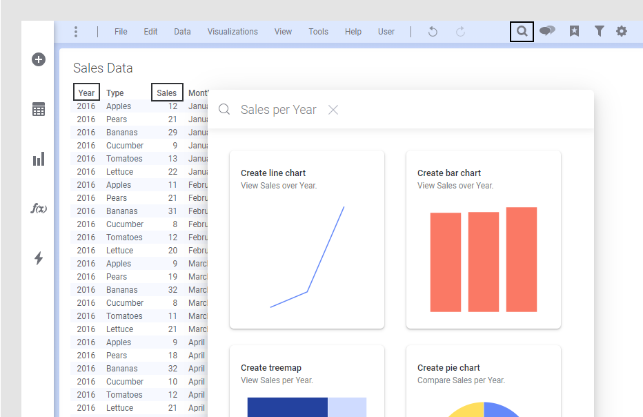 en la barra de menús. En el campo de búsqueda abierto, escriba lo que desea visualizar y sugiéranos visualizaciones para las coincidencias encontradas. Por ejemplo, si escribe los nombres de las columnas de datos que desea examinar, se sugieren visualizaciones como se muestra en la imagen siguiente. A continuación, haga clic o arrastre la que le interese al análisis y examínela.