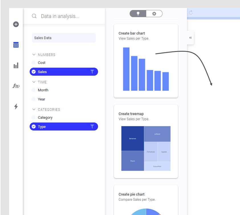 en la barra de creación y, en el menú flotante abierto, seleccione las columnas de datos que le interesen. Entre las visualizaciones recomendadas, haga clic o arrastre la que le interesa en el análisis y examínela.