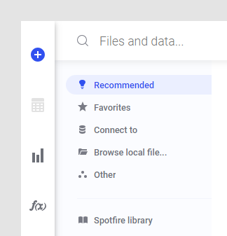 Spotfire로 작업할 때 가장 중요한 것은 데이터입니다. 모든 데이터는 작성 막대의 파일 및 데이터를 클릭하여 액세스합니다.