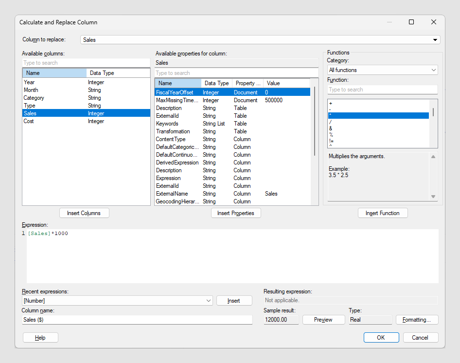 | 示例结果 | 显示将当前表达式应用到数据表第一行的结果。请注意,如果表达式中使用了聚合函数(例如“Count”),则在示例计算中仅会使用前 100 行。如果该字段显示错误,就说明表达式有问题。将鼠标指针移动到“表达式”字段旁边的红色感叹号上将会显示错误内容的说明。 |