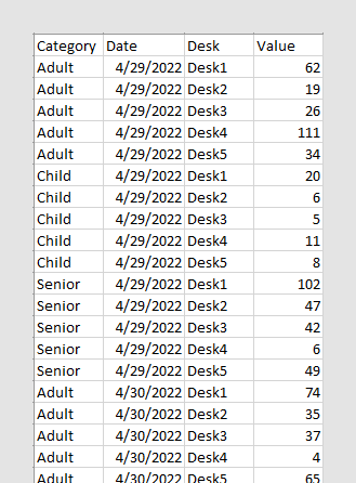 在下面的电子表格中,相同的数据以高/窄格式进行组织。多个服务台的值已合并到单个列。