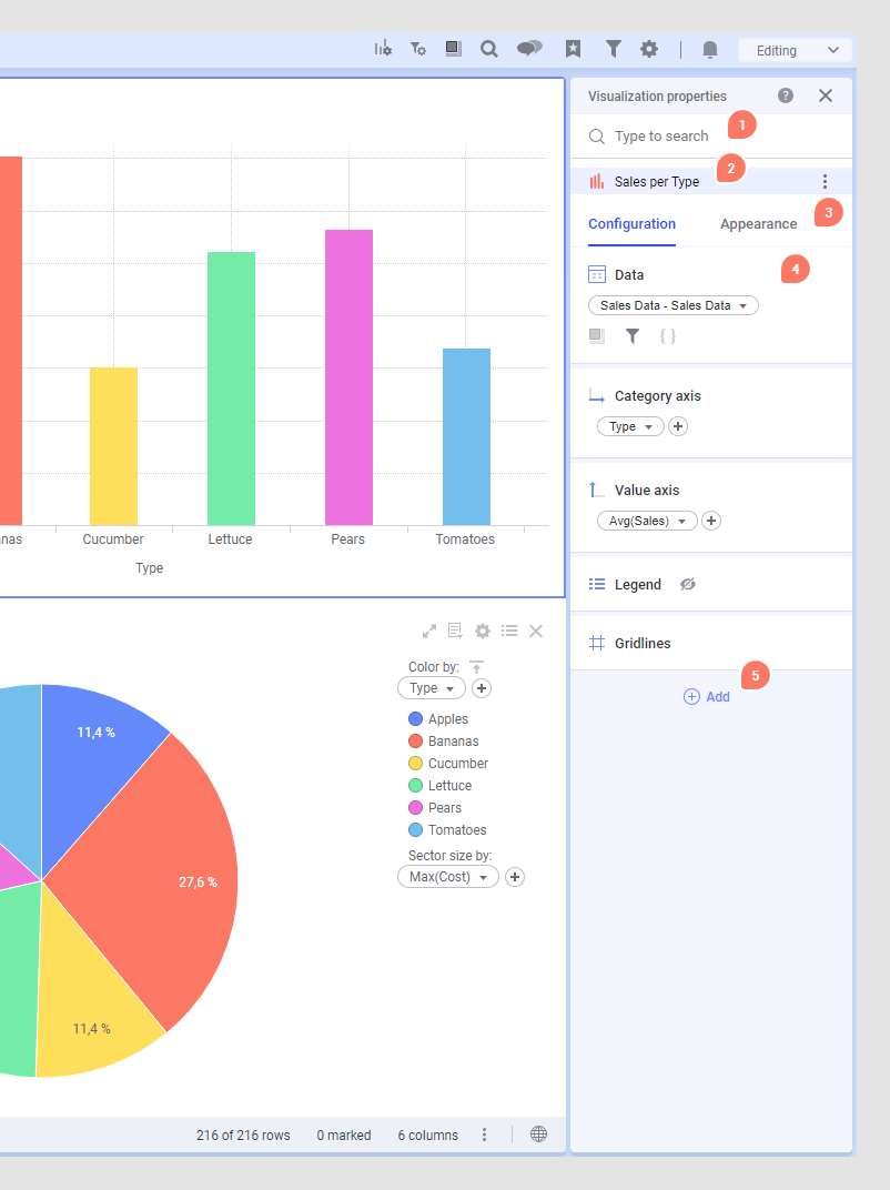 - 属性卡 - 每个图表属性及其相关设置通常包含在一张属性卡中。您只能在面板中看到已为活动图表配置的卡。有关更多详细信息,请参见以下部分。
