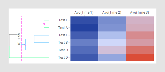 层级群集根据项目之间的距离或相似度在采用树形结构的层级中排列项目。生成的层级的图形表示为树状结构图表(称为树形图)。在 Spotfire 中,层级群集和树形图与热图图表紧密连接。您可以在热图中对行和列进行群集分析。行树形图显示了行之间的距离或相似度以及进行群集分析所得的各行所属的节点。列树形图显示了变量(所选单元格值列)之间的距离或相似度。