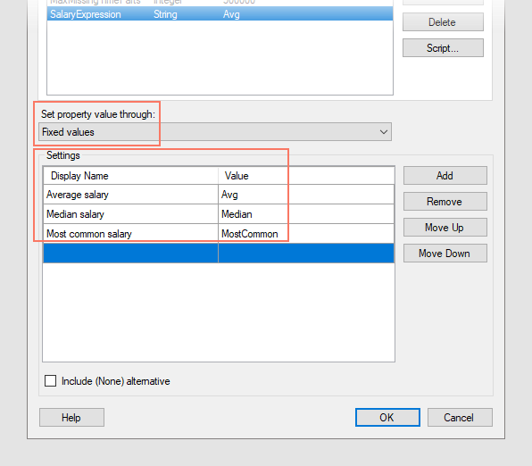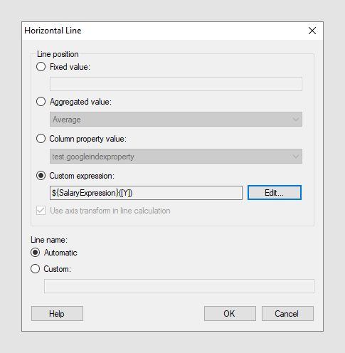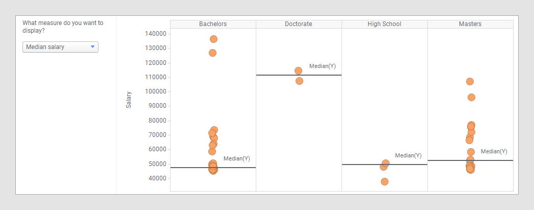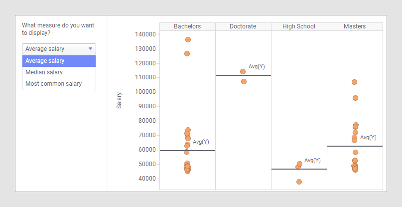 In this example, a scatter plot is used to show salaries for employees, trellised per education level. The text area contains a property control in the form of a drop-down list, where a dashboard user can select to add horizontal lines that show either the average, the median, or the most common salary within each education level.