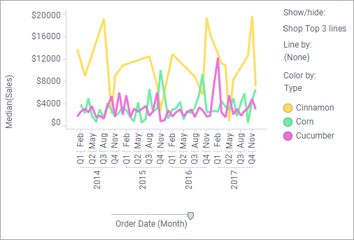 When you filter out values you change the underlying data used to calculate the items available in a visualization. However, sometimes you might want the calculations to be exactly the way they are, but you are only interested in some of the values in the resulting visualization. This is when you can use Show/Hide Items.