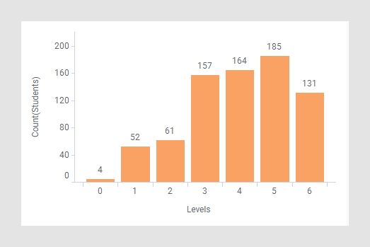 L'histogramme affiche le nombre d'élèves qui ont atteint différents niveaux dans un test. Par exemple, 52 élèves ont atteint le niveau 1 et 131 ont atteint le niveau 6.