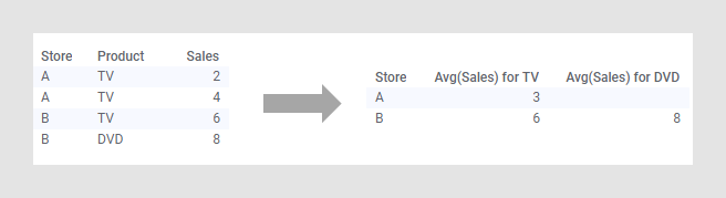 以下示例显示了对一个非常简单数据集的转置转换。原始数据表中有三列和四行。每行包含两个百货商店(A 或 B)中的一个、一种产品(TV 或 DVD)以及销售数量的数字值。如果每天添加新行,数据表可能会与此类似。