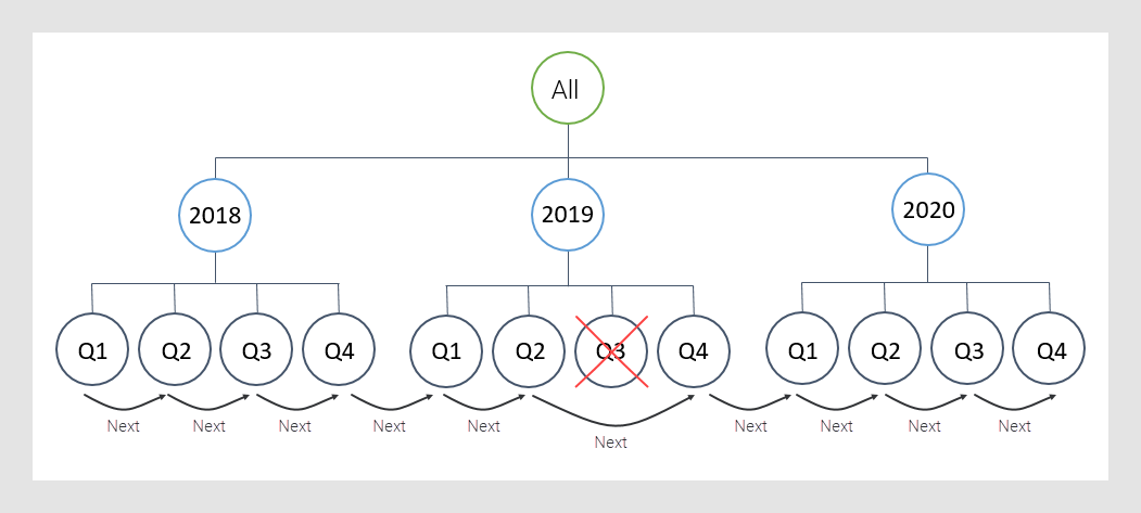 If the value following the current node is not available (such as the Q3, 2019 value above), the method looks for the very next, not missing, value (in this case Q4, 2019).