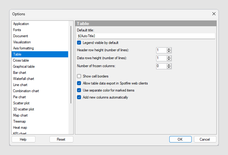 | Allow table data export in Spotfire web clients | Specifies whether a Spotfire web client user is allowed to export the data from the table. |