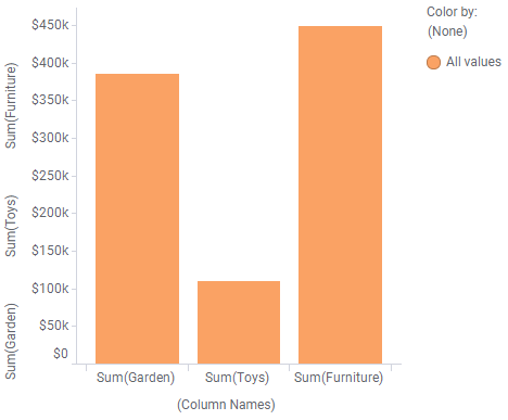 The bar chart shows the sums of sales at three different departments in a store. The data is retrieved from three columns, that is, more than one column is selected on the value axis.