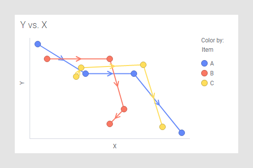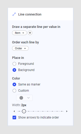 You can add a connecting line between markers in a scatter plot, or in a marker layer of a map chart. You can specify in which order the markers should be connected, and arrows can be added to indicate a direction or movement.
