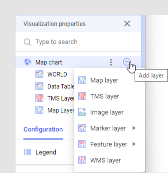 A map layer gives a geographical context to your data by rendering a worldwide map background under your data layers. You can add multiple map layers in one map chart. - Adding a TMS layer