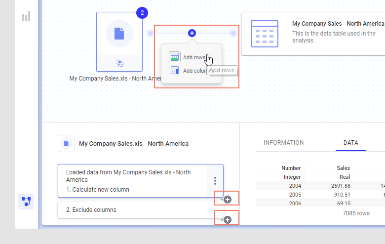 In this example, data has already been opened from a local Excel file. In the Data canvas, select the data table of interest, determine where you want to add rows (between the nodes in the graphical structure or between transformation groups), and click Add rows: