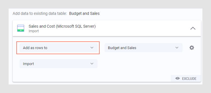 When you add data from the Files and data flyout, you can select to add the data as new rows in another data table from the final step in the add data workflow: