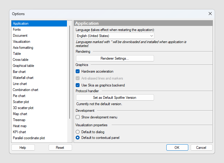 | Language | Select which language should be used for Spotfire when it is started. This setting affects the language used in the application, but not in the data itself. Language settings for the data are controlled by the column formatting. Changes here take effect the next time Spotfire is started. |