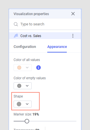 For the scatter plot, 3D scatter plot, and the marker layer of a map chart, you can find the Shape selector under the Appearance tab in the visualization properties panel, or under Shape in the visualization properties dialog or popover.