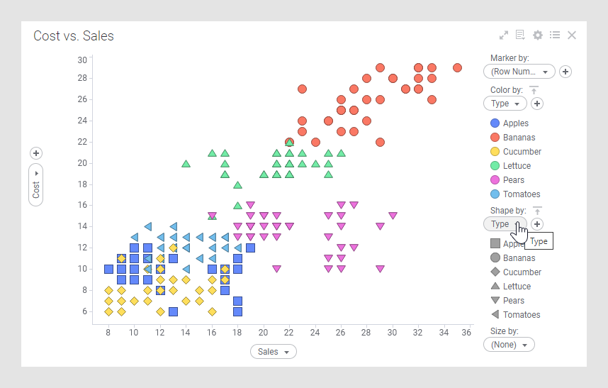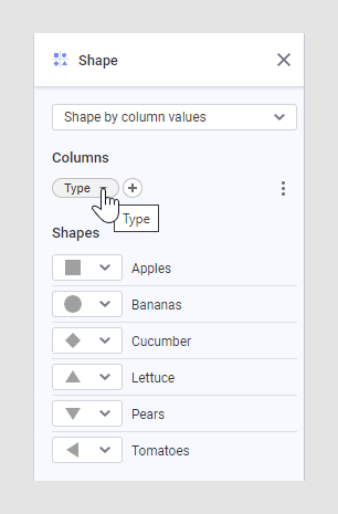 To let the values in a column determine what shape the markers in different categories should have, you can select a column under the Shape (or Shape by) control in the visualization properties (under Configuration in the visualization properties panel, or Shape in the dialog), or in the legend. Depending on where you are changing the settings, sometimes, you must first select Shape by column values (or similar) from the drop-down menu or radio buttons.