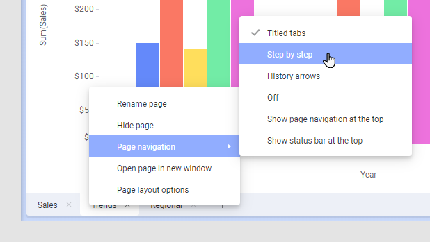 The pages are indicated by titled tabs at the bottom or top of the analysis, and you click these tabs to switch pages. Use this method when you want to see the titles of the pages and be able to easily locate a certain page by its title.