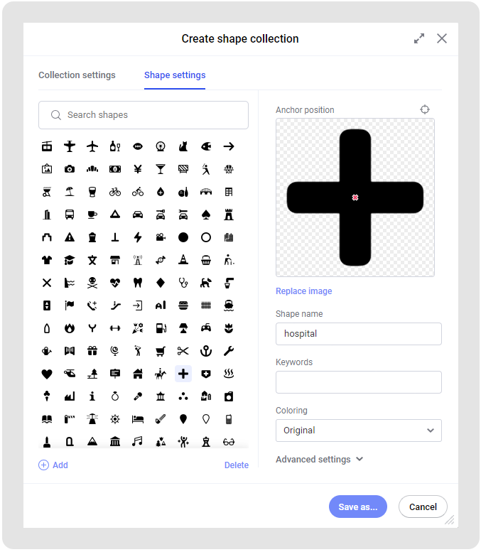 When creating a new shape collection or editing an existing one, you can configure its collection and shape settings.