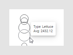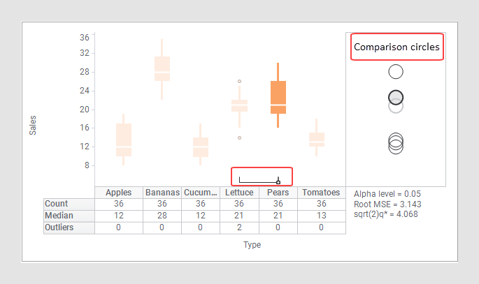 In the example above, the sum of sales is shown for a number of different fruits and vegetables. The box for Pears has been marked, which is also indicated in the corresponding comparison circle. The marked comparison circle is shown with a darker border and a transparent fill. By looking at the comparison circles or the little relation indicator at the bottom of the visualization area (circled in red on the image), one can see that the sum of sales for Lettuce does not display a significantly different group mean, whereas the group means for all other fruits and vegetables are significantly different from that of Pears. The square in the relation indicator indicates the marked box and the lines in the relation indicator extend to any boxes that are not significantly different from the marked one.