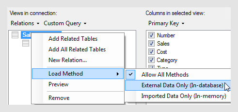 In a data connection, you can control what load methods are allowed for each selected data table (view). Either, you can determine that data must be imported into the Spotfire data engine, or that data must be kept external, to be used in-database only.