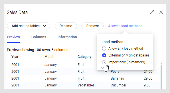 By default, when you open a data connection, you can select the load method for each table you add to your analysis. If you have configured an allowed load method for a table, only that option is available when you add data from the connection.