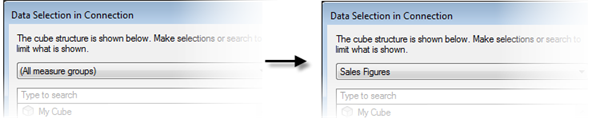 Most of the times, you will probably only be interested in analyzing data from a single measure group, but there may be exceptions. It is important to know what you are doing if you are working with cube data in Spotfire. For example, if data is selected from two different, unrelated measure groups you might end up with empty visualizations.