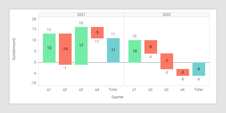 Selecting Continue over trellis results in the following waterfall. The first value in the 2021 panel starts where the last value in the 2022 panel ended.