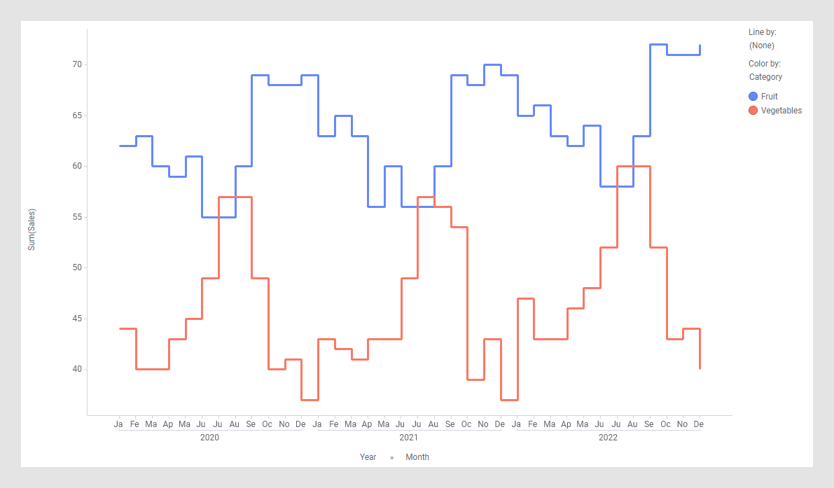The line chart can also be used as a step chart, where the lines are drawn in incremental steps rather than as straight lines between each value.