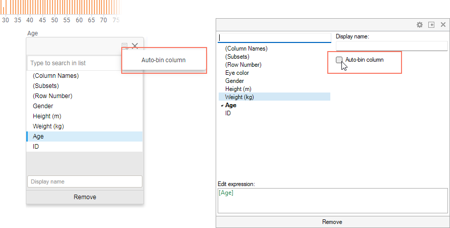 You decide how many bins the range should be divided into. When binning the data, a slider is shown which can be dragged to show the desired number of bins. The bar chart below is based on the same data as above but adjusted to show more bins.