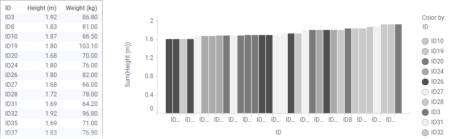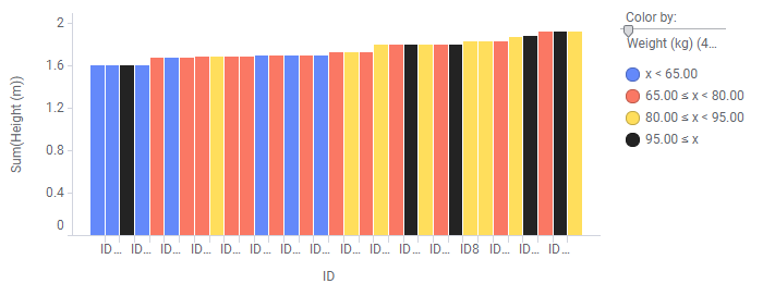 By coloring the bars by weight, and binning the numerical values, it is easy to distinguish individuals in certain weight intervals. In the image below, the range is divided into 4 bins. Individuals that might weigh too much for their heights, can be spotted.
