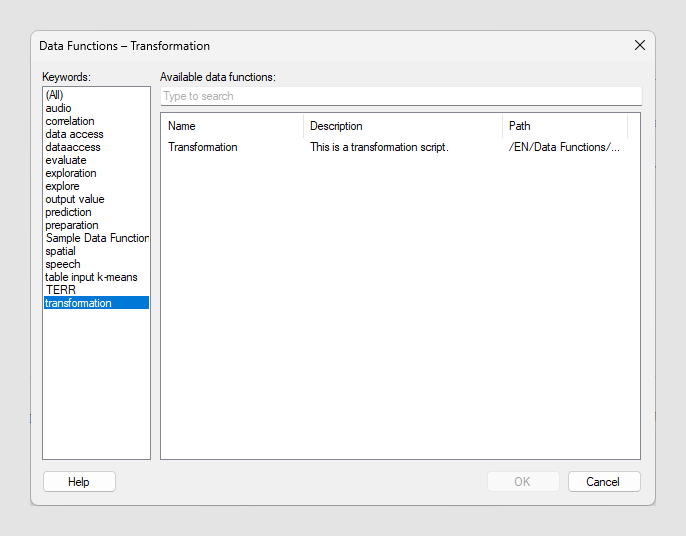 The Data functions - transformation transformation is used when you want to use a data function from the library as a transformation. Data functions can be used as transformations if they use a single data table as input and produce a single data table as output.