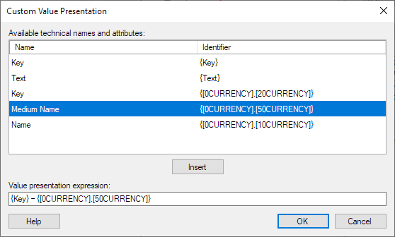 In this dialog, you can define a custom value presentation for a SAP BW characteristic or hierarchy. You can combine available technical names and attributes to your liking, and customize the presentation with other characters.