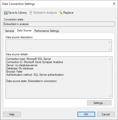 | Connection state | Shows the current state of the data connection. Either it is Embedded in analysis which means it is available for editing, or it is Shared in library. |