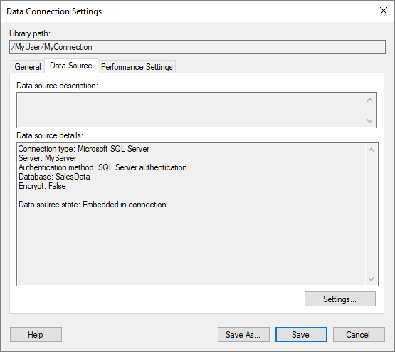 In the Data Connection Settings dialog, you can edit various settings in a data connection. This page provides information about the settings and controls on the Data Source tab.
