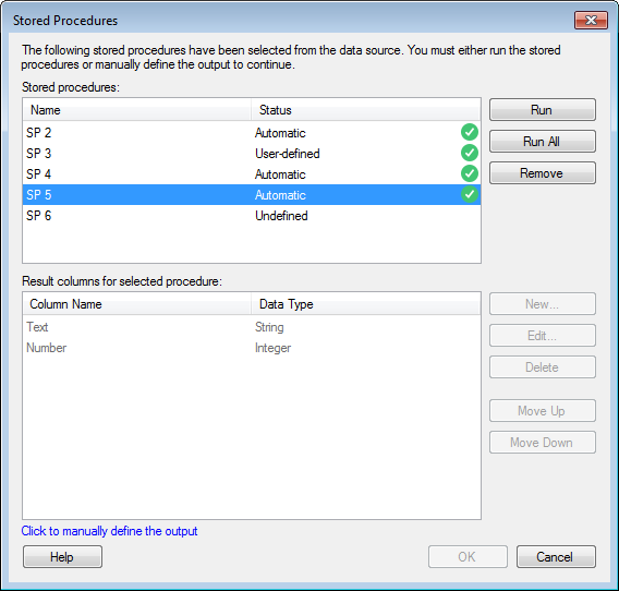 Lists the stored procedures that you are adding to the data connection. If you are editing an already defined data connection, then, only the stored procedure that you clicked on will be shown here. You must define result columns for all stored procedures that show a status that is 'Undefined' or 'Failed' before you can continue. |