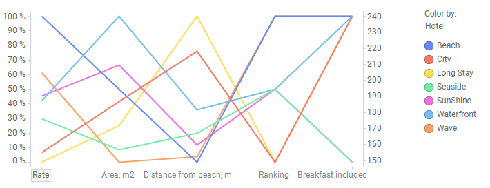In the parallel coordinate plot below, the 'Rate' label has been clicked. The actual scale for the rates is shown to the right of the lines.