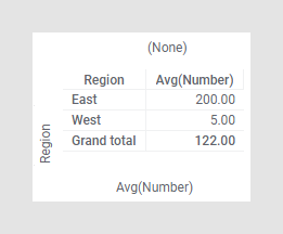 The expression used for calculating the cell values is average (Avg). The Grand total is calculated on the underlying rows ((200+300+1+9+100)/5=122), and not on the cell values.