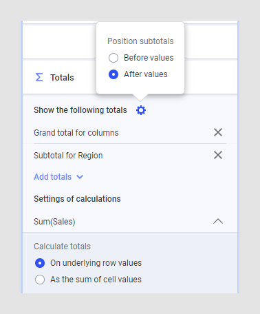 By default, grand totals and subtotals in a cross table are calculated using the same aggregation or expression that is used for calculation of the cell values, and the calculations are based on the underlying data table rows. However, it is possible to base the totals calculations on the aggregated cell values. Then totals will be calculated as the sum of the cell values, no matter the expression used for the cell values.