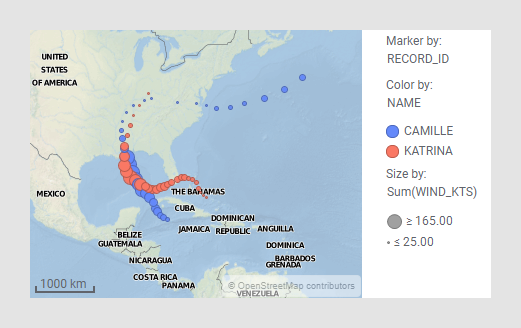 Separate lines are drawn for the two hurricanes as specified in the topmost setting. The "RECORDED_ID" column, that lists the order of measures, is selected below Order each line by to indicate in which order the markers should be connected. The added lines result in curves that show how each hurricane moves.