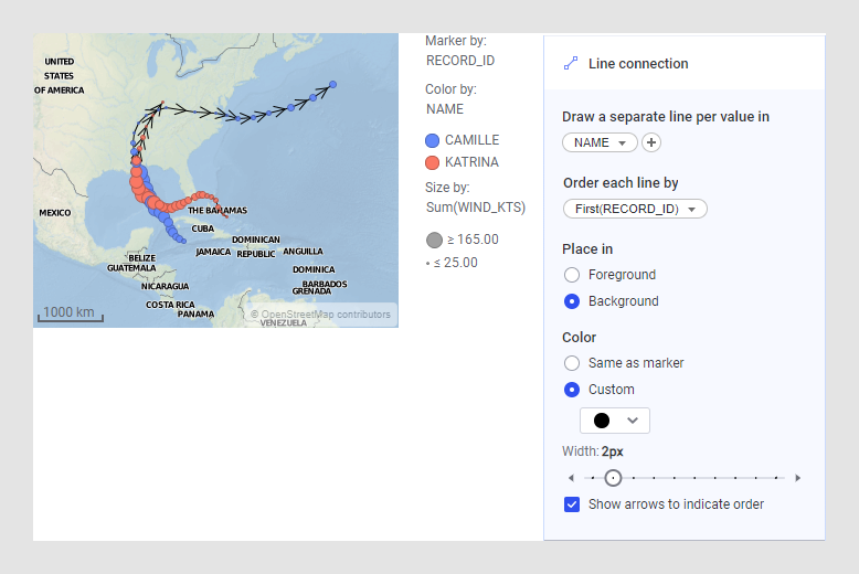 To emphasize the hurricanes' advance, you can connect the markers with lines. The settings are made in the Line connection section of the visualization properties for the marker layer. The image shows the visualization properties panel but the settings are similar no matter from where you open the visualization properties.